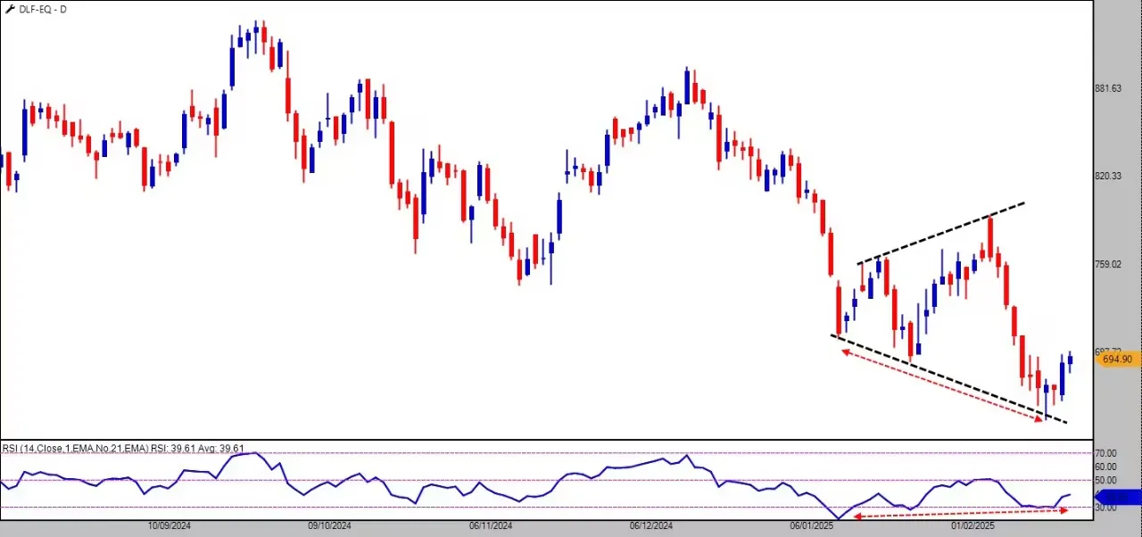 रिलेटिव स्ट्रेंथ इंडेक्स (RSI) पर पॉजिटिव डायवर्जेंस रिवर्सल के प्रति विश्वास को और अधिक बढ़ाता है. मेगाफोन पैटर्न के सपोर्ट लेवल पर RSI, एक बुलिश डायवर्जेंस दिखा रहा है, जो दर्शाता है कि नीचे की ओर मोमेंटम कमजोर हो रहा है और खरीदारों का असर बढ़ना शुरू हो सकता है. इससे संकेत मिलता है कि रिवर्सल की संभावना काफी अधिक है. यही वजह है कि आने वाले महीनों में DLF एक ऐसा स्टॉक बन गया है जिस पर नज़र रखनी चाहिए.