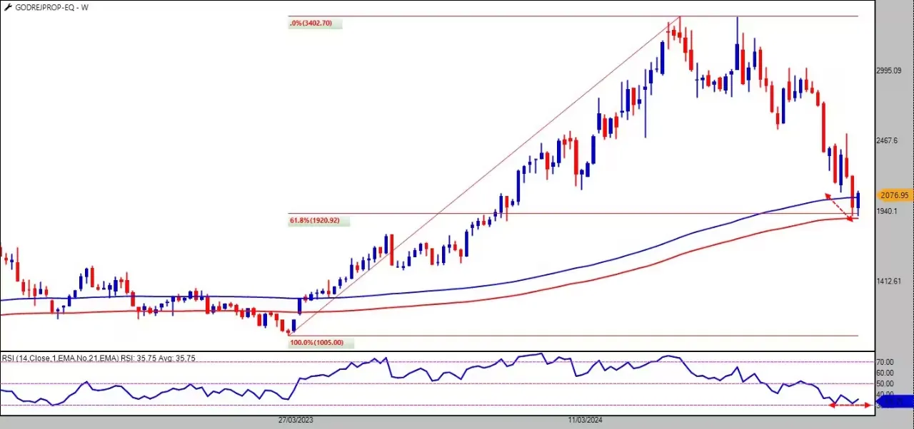 इसके अतिरिक्त, 61.80% फिबोनाची रिट्रेसमेंट लेवल, जो पोटेंशियल रिवर्सल प्वाइंट्स की पहचान करने के लिए व्यापक रूप से इस्तेमाल किया जाने वाला टूल है, 200WEMA चैनल के साथ मेल खाता है. फिबोनाची रिट्रेसमेंट अक्सर उन एरिया का संकेत देते हैं, जहां कोई एसेट महत्वपूर्ण मूव के बाद अपना डायरेक्शन बदल सकता है. 61.80% रिट्रेसमेंट का 200WEMA के साथ तालमेल होना, गोदरेज प्रॉपर्टीज में रिवर्सल की संभावना को और भी मजबूत कर रहा है.